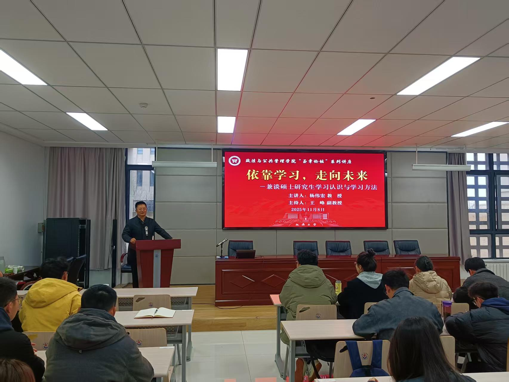 11月8日上午,校党委副书记杨伟宏教授为政管学院2025级全日制研究生做了题为“依靠学习走向未来—兼谈硕士研究生学习认识与学习方法”的专题讲座。讲座由分管研究生工作副院长王峰主持,院长常改香、研究生秘书、2025级全体全日制研究生及部分高年级研究生100余人参加。