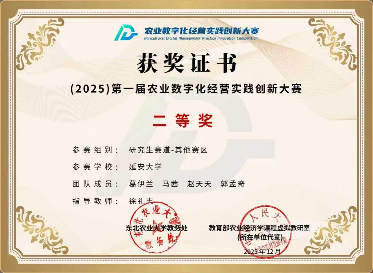 12月6日,由教育部农业经济学课程虚拟教研室与东北农业大学联合主办的第一届农业数字化经营实践创新大赛历时28天圆满落幕。大赛吸引了来自中国人民大学、四川农业大学、广州中医药大学等46所院校的1696名学生报名参赛。我院应用经济学2025级硕士葛伊兰、马茜、赵天天、郭孟奇组成的参赛团队在徐礼志老师的精心指导下,经过多轮集中培训与分组演练,凭借扎实的专业素养和良好的团队合作脱颖而出,荣获全国决赛二等奖。