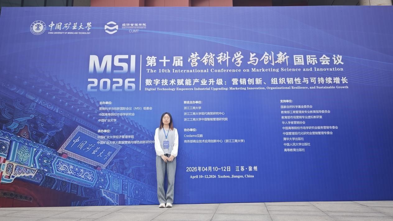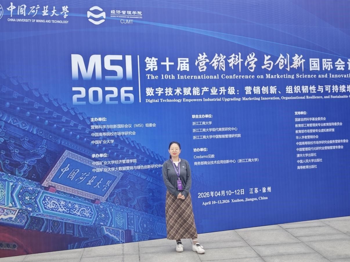 2026年4月10日至12日,第十届营销科学与创新国际会议(MSI 2026)在江苏徐州中国矿业大学举办。本次会议以“数字技术赋能产业升级:营销创新、组织韧性与可持续增长”为主题,吸引了来自全球近200所高校、科研机构及企业界的800余名专家学者,共同探讨数智时代营销科学的前沿理论与创新实践。经管学院张建洁老师及其硕士研究生秦萌瑶同学应邀参会。